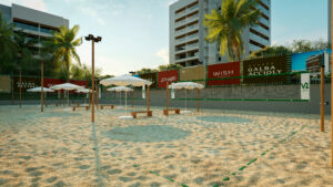 São quatro quadras de areia prontas para modalidades como beach tennis, vôlei de praia e futevôlei. O espaço também conta com vestiários, playground, pet place e uma agradável área de convivência cercada por verde. Todo o espaço é pensado para reunir pessoas em um ambiente leve e acolhedor.